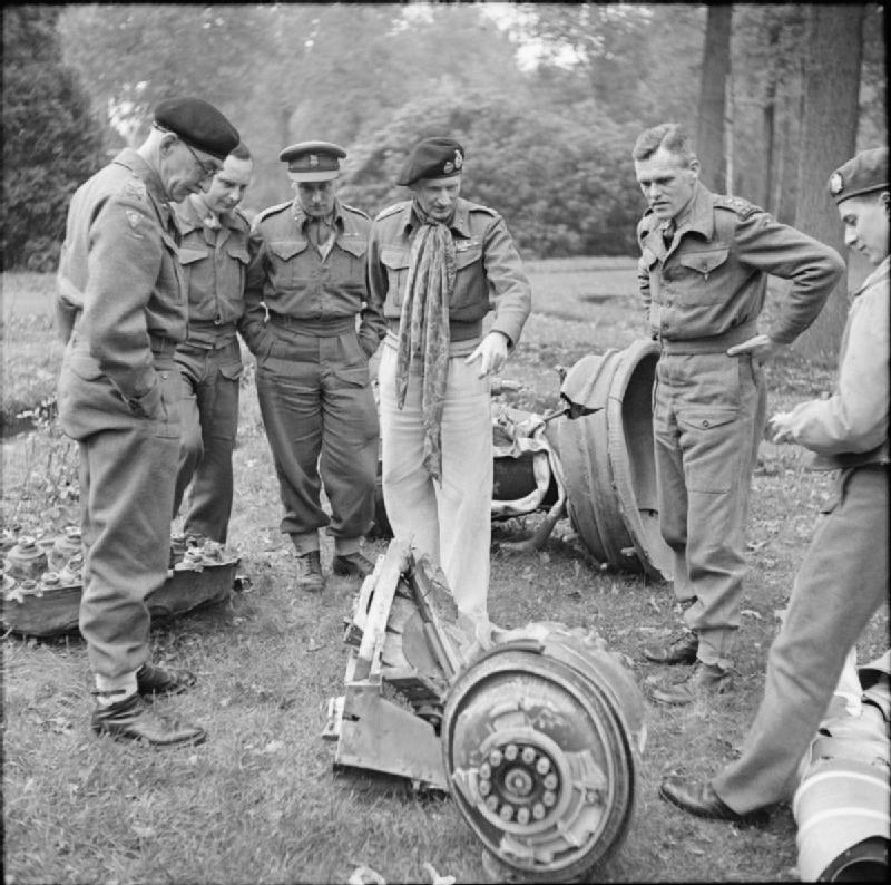 Percy Hobart (left) examining fragments of a V2 that landed near his headquarters.